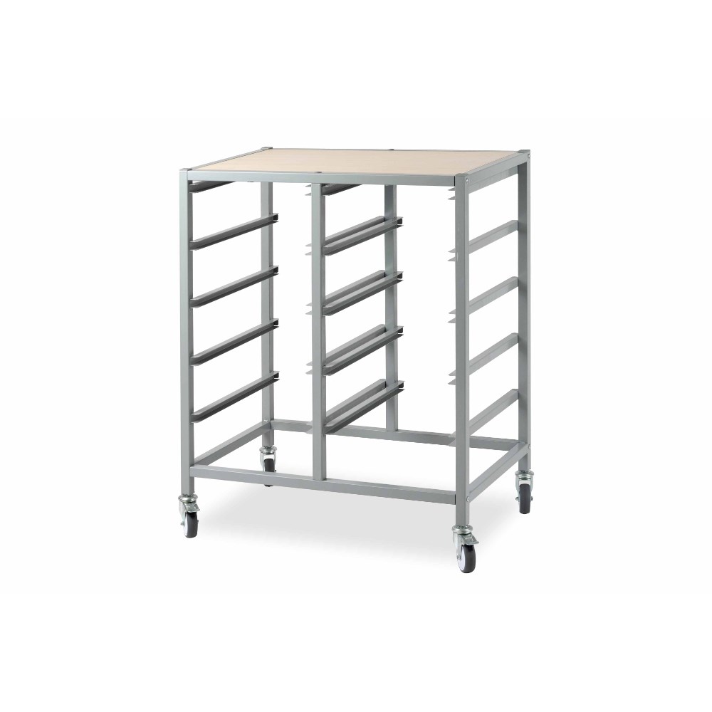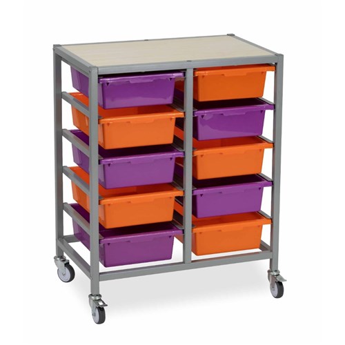 Double trolley frame only. Perfect to use with the Tote trays range. Also available as 5 and 15 bay storage unit, please see codes 2793880 and 2793878. Mix and match the tote tray colours to create a stimulating learning space. The perfect storage solution for the classroom. Constructed metal frame and mounted on lockable castors. White or oak wood laminate finish top - choose when assembling. Delivery, installation and assembly charges may apply to furniture. Please enquire to confirm.