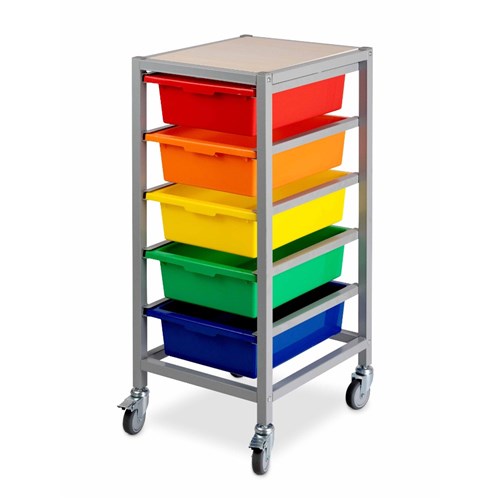Single trolley frame only. Perfect to use with the Tote trays range. Also available as 10 and 15 bay storage unit, please see codes 2793878 and 2793879. Mix and match the tote tray colours to create a stimulating learning space. The perfect storage solution for the classroom. Constructed metal frame and mounted on lockable castors. White or oak wood laminate finish top - choose when assembling. Delivery, installation and assembly charges may apply to furniture. Please enquire to confirm.
