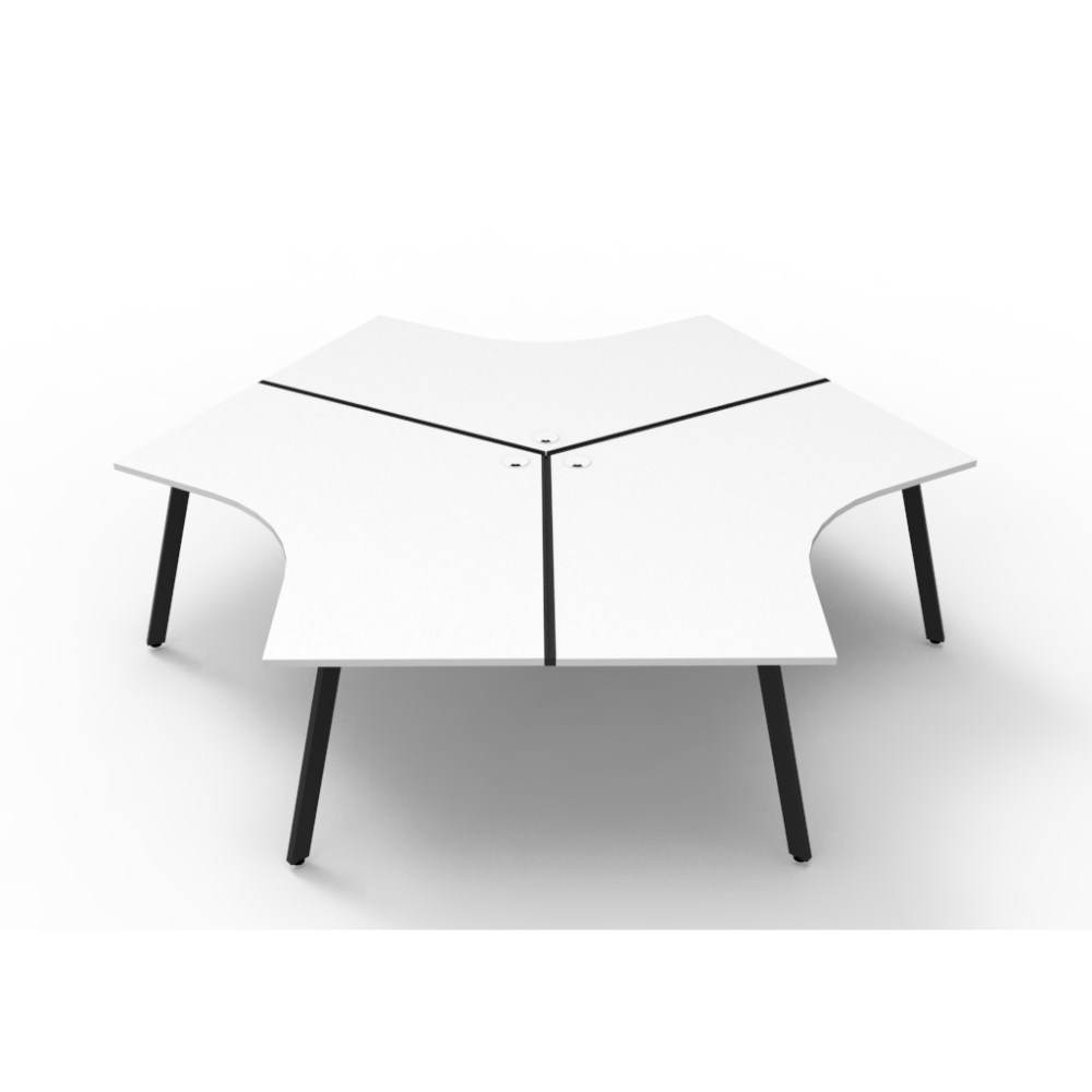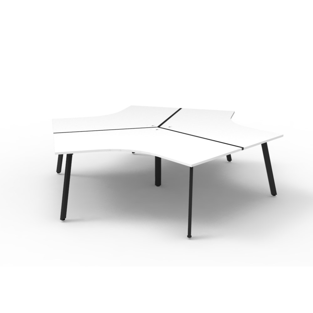 Overall Dimensions: 2866W x 2480D x 730mmH. Dimensions Per User: 1205W x 1205D x 730mmH. White worksurface with a 60 x 30mm powder coated black Eternity leg underframe. 1 x 80mm diameter cable entry hole. 30mm cable access void in between double sided users. Infill rail available at additional cost. Dual cross bar for added stability. E0 enviroboard melamine worksurface. Adjustable leveling feet. 5 Year Manufacturer's Warranty. Delivery, installation and assembly charges may apply to furniture. Please enquire to confirm.