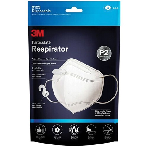 Helps protect against airborne particulates. The respirator is worn over the mouth and nose and attaches via elastic side bands with hook attachment behind the base of the head/top of the neck. 3M Advanced Electrostatic Media Filtration technology. Flat fold. Suitable for house hold dust, airborne pollen, bush fire particles, exhaust particles and airborne particles.