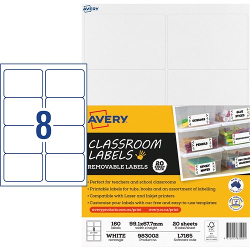 Avery Classroom Labels Laser Printer 99.1 x 67.7mm White 160 Labels 20 Sheets