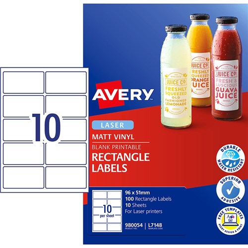 Avery Durable Blank Printable Labels L7148 96x51mm Rectangle Matte White 10UP 100 Labels