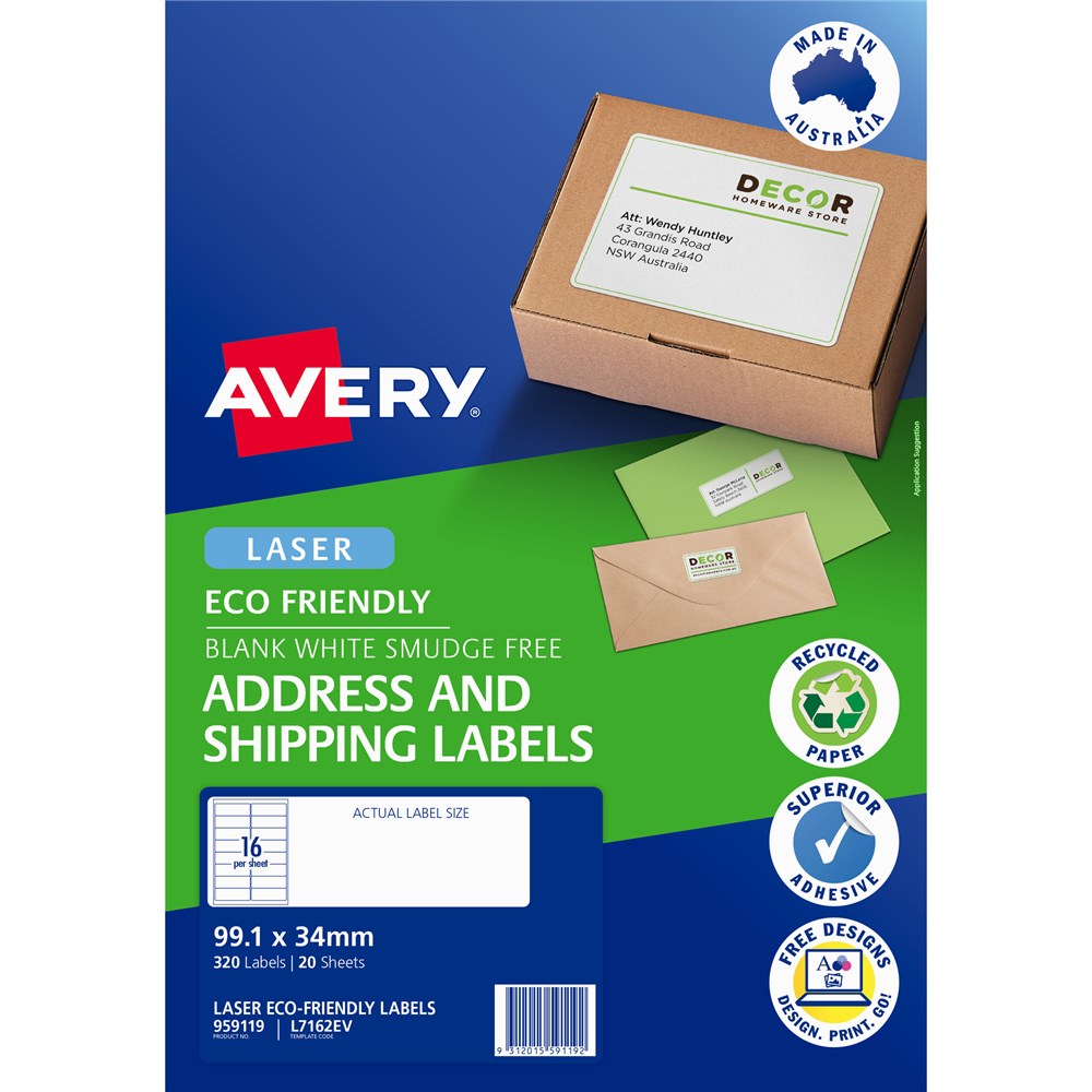 Avery Eco Friendly Labels Laser Printer White 99.1x34mm 16UP 320 Labels