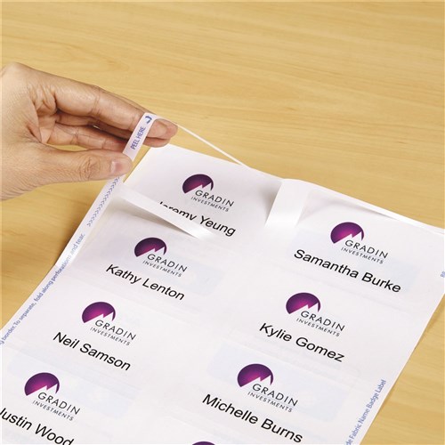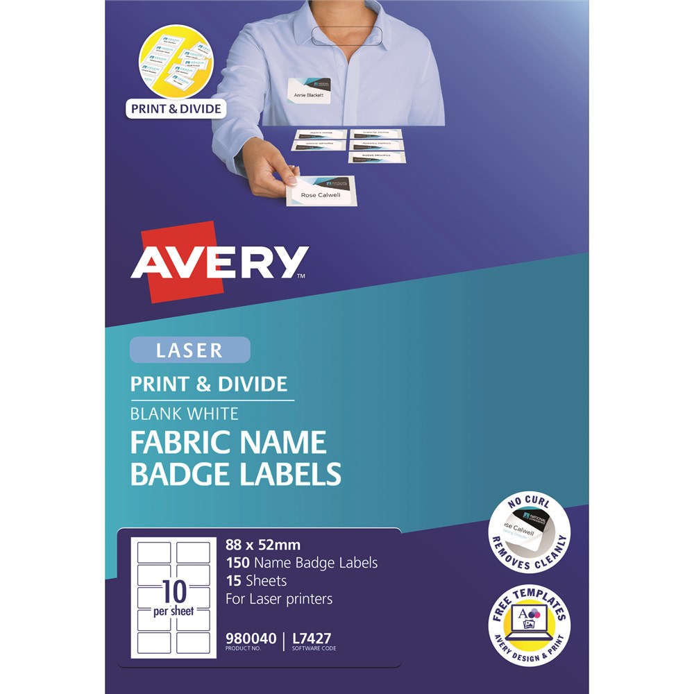Ideal for seminars, meetings, trade fairs, conferencing, training sessions, schools and childcare centres. Fabric material is made from flexible acetate silk, can be used on most textiles and removed without leaving residue. Label will move with the clothing, without curling or peeling. Jam Freeâ„¢ reliability for trouble free printing on laser labels. Keep your facility safer by creating name badges on demand for employees and visitors Customise your labels with Avery Design and Print, available at averyproducts.com.au/print. Size: 88x52mm 150 labels, 15 sheets. 10 labels per sheet (10UP).