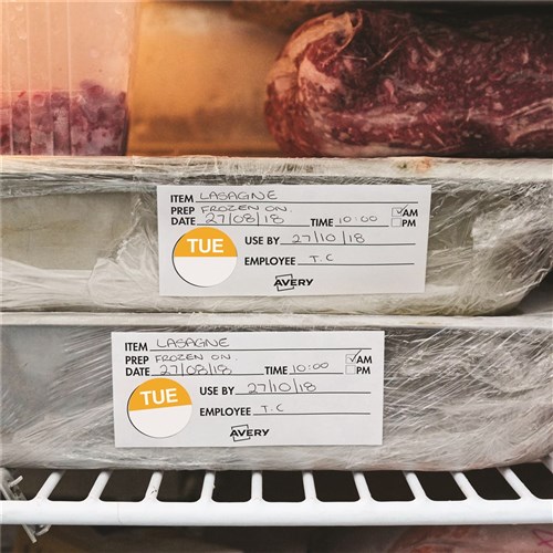 Visually identifies discard date of prepared food. Space to write the date on the label. Ideal for commercial refrigeration and food storage applications. Temperature -5 to +65C. Removable adhesive adheres to a variety of surfaces and removes easily.