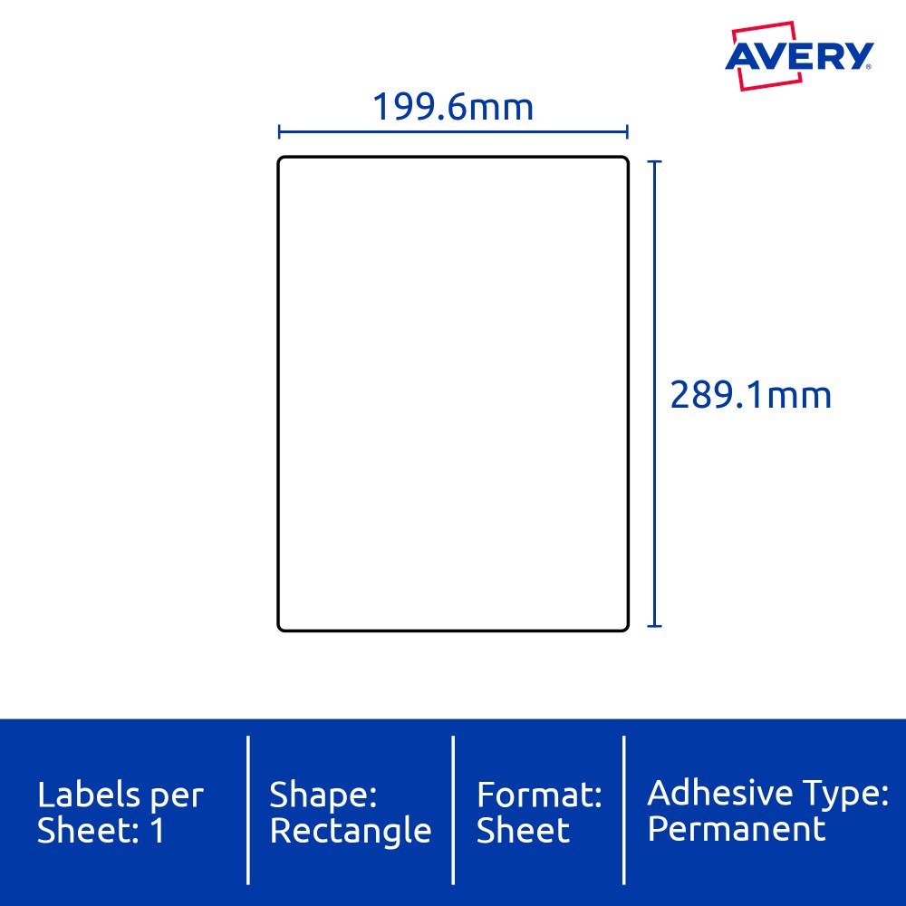 Heavy duty, waterproof, UV, oil and tear resistant unaffected by temperatures between -20°C to 80°C. Ideal for labelling equipment and organising property. Engineered to take on tough applications where a standard label is not fit for purpose. Customise your labels with Avery Design and Print, available at averyproducts.com.au/print. Made in Australia. Size: 199.6x289.1mm 25 labels, 25 sheets. 1 label per sheet (1UP).