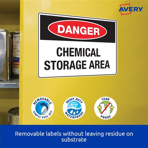 Weather, UV, oil and dirt resistant. Unaffected by temperature variations -20°C to +80°C. Removable adhesive formulated to adhere to a wide variety of surfaces without leaving residue. Ideal for creating temporary labelling of equipment, facilities and storage supplies, stock take and organising workshops. Customise your labels with Avery Design and Print, available at averyproducts.com.au/print. Size: 99.1x139mm 80 labels, 20 sheets. 4 labels per sheet (4UP).
