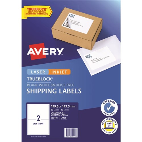 Ideal for addressing and shipping of letters, parcels and boxes. Jam-Free reliability for trouble free printing, saving time and minimising wastage. Whether you are selling items online or just wanting to send a small parcel. Trueblock labels feature an opaque black backing which completely covers up and blocks out existing labels or previous information on parcels or boxes. Customise your labels with Avery Design and Print, available at averyproducts.com.au/print. FSC certified labels made with paper from well-managed forests. Size: 199.6x143.5mm 20 labels, 10 sheets. 2 labels per sheet (2UP).