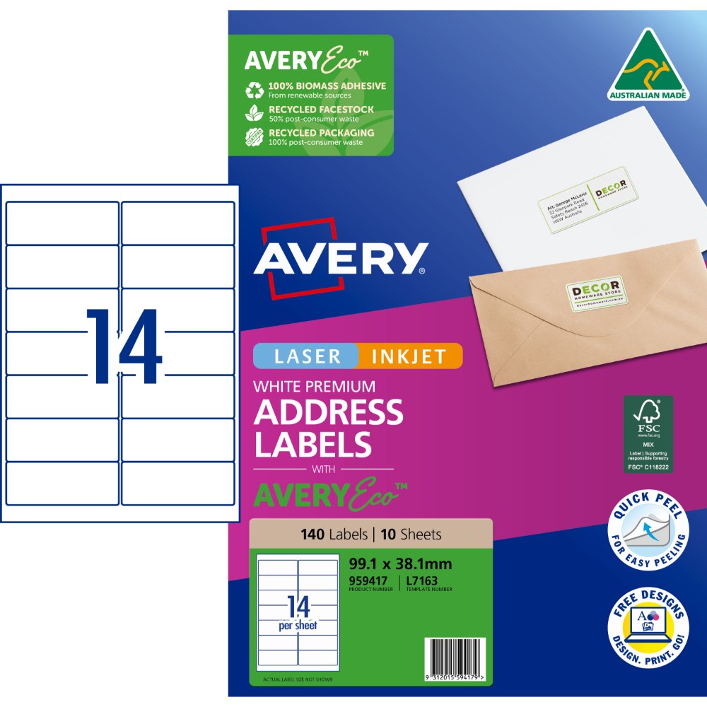 Avery Premium Address Labels White Laser Inkjet AveryEco L7163 99.1x38.1mm 14UP 140 Lab