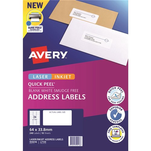 SureFeed™ technology is engineered to help provide a more reliable feed through your printer. Compatible with Laser and Inkjet printers. Address Labels have Quick Peel™ Pop-up Edge™ making peeling the label faster and easier, simply bend back the sheet and the edge pops up, just peel and apply 12-65 up. Jam-Free reliability for trouble free printing, saving time and minimising wastage. Labels use Opaque TrueBlock® technology which completely covers everything underneath. Customise your labels with Avery Design and Print, available at averyproducts.com.au/print. FSC® certified labels made with paper from well-managed forests. Made in Australia. Size: 64x33.8mm 240 labels, 10 Sheets. 24 labels per sheet (24UP).