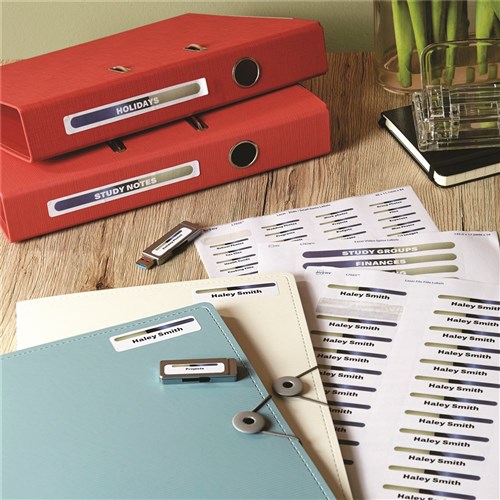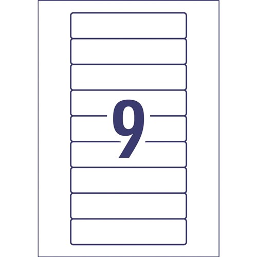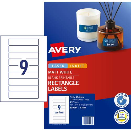 Permanent adhesive sticks to multiple surfaces like glass, metal, paper and plastic. Compatible with Laser and Inkjet printers. Ideal for identifying objects around the home or office. FSC® certified labels made with paper from well-managed forests. Size: 133x29.61mm 225 labels, 25 sheets. 9 labels per sheet (9UP).
