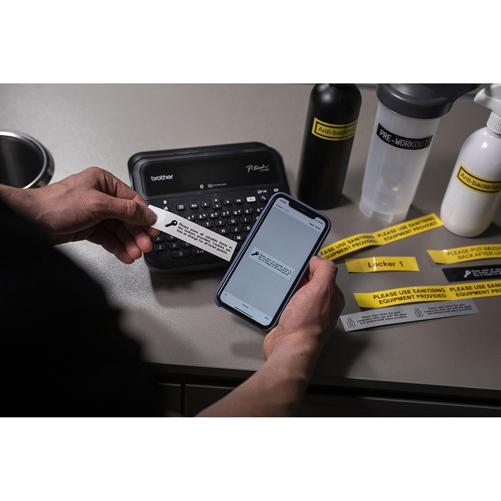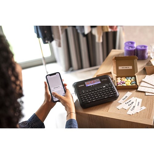 USB and Bluetooth connectivity. Battery powered (not included). Prints on durable TZe laminated tape. Printing resolution is 180 x 360dpi. Print speed is 30mm per second. LCD display has a 320dpi resolution with backlight. Automatic tape cutter. Prints 3.5, 6, 9, 12, 18 and 24mm tape. Store up to 99 label templates for quick reprints. Wide and easy to use QWERTY keyboard. 17 fonts with 17 styles and over 900 symbols. Includes free P-touch Editor label design software with barcode print capability.