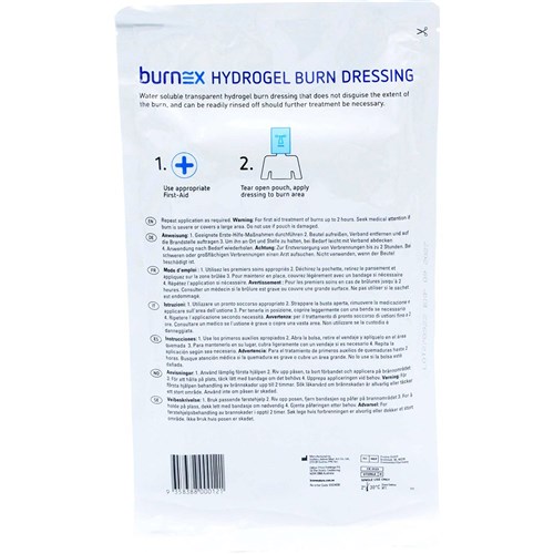 Burnex burn hydrogel is first aid burn treatment and can be used for minor burns, scalds and sunburn. Cools, soothes and helps relieve pain. Water soluble transparent hydrogel that does not disguise the extent of the burn, and can be readily rinsed off should further treatment be necessary. Helps prevent contamination. Off white/translucent gel impregnated into a white foam. Health Warning: Always read the label and follow the directions for use. Warning: For first aid treatment of burns up to 2 hours. Seek medical attention if burn is severe or covers a large area. Do not use if pouch is damaged. For severe burns seek medical attention. Store below 30 degrees Celsius.