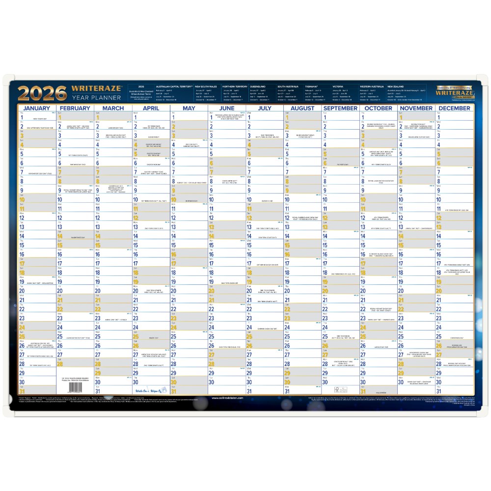 Laminated planner for write on/wipe off applications, supplied with quality dry erase marker, marker clip and adhesive mounting blocks. Includes all Australian holidays and important dates, with shaded weekends for easy weekly planning. Size: 700 x 1000mm. FSC Certified.