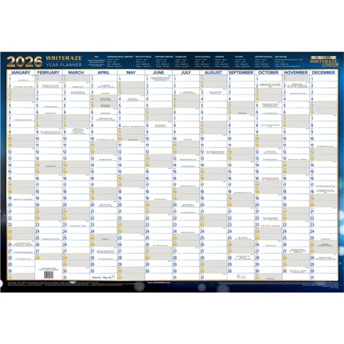 Laminated planner for write on/wipe off applications, supplied with quality dry erase marker, marker clip and adhesive mounting blocks. Includes all Australian holidays and important dates, with shaded weekends for easy weekly planning. Size: 700 x 1000mm. FSC Certified.