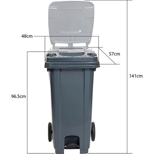 Sturdy Wheelie bin ideal for recyclables and waste. Hygienic push pedal non touch bin. Dimensions: 480W x 570D x 965mmH. When lid is open height is 1410mm.