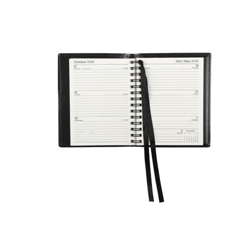 Features a stylish flexible leatherette look cover. Spiral bound to sit flat on the desk. 3 year reference calendars. Weights and measurements. Includes Australian and NZ holidays. Current and forward year planners. Ribbon marker. A6 Week to View format No appointment times.