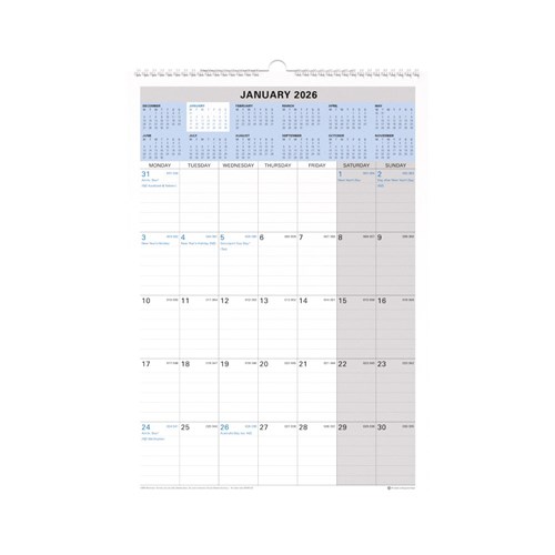 Featuring easy-to-read graphics and a clear layout, the 12-month progressive calendars atop each page serve as useful reference tools. Features: Australian and New Zealand Holidays Julian Days (Calendar Only) Shaded Saturday and Sunday. Size: 432 x 305mm. FSC Certified.