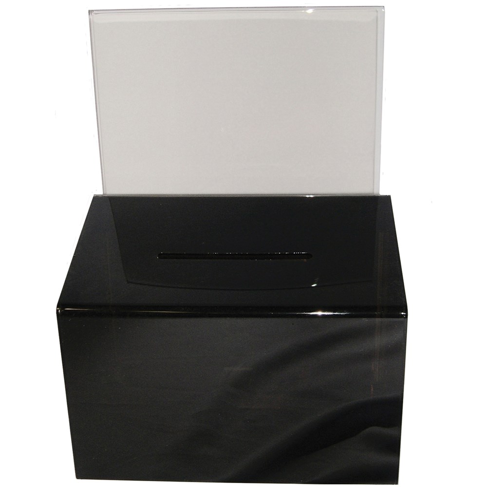 310W x 210D x 240mmH. Slot size 150 x 10mm. Ideal for competitions, suggestions and much more. Supplied with A4 landscape header card. Constructed of high quality acrylic in smoke colour with super grip non slip rubber feet. Lockable - supplied with 2 keys.