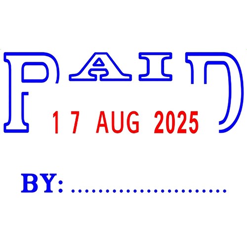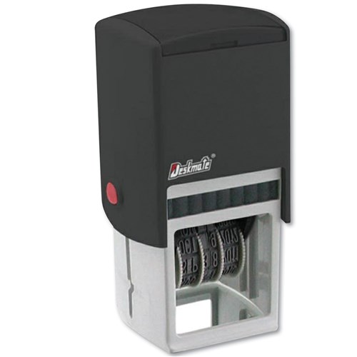 Self-inking dater stamp. All daters print day, month and year. Built in ink pad - red date with blue text. Each stamp has 12 consecutive years of date bands. Impression size: 4mm date size. Max impression Area: 26 x 40mm.