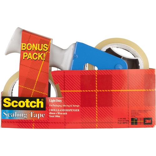 Scotch® Sealing Tape is ideal for light duty and non-critical applications. Contains: 2x 48mmx50m Tape plus PTD-1 pistol grip dispenser. Dispenser holds all standard packaging tapes, up to 100m length.