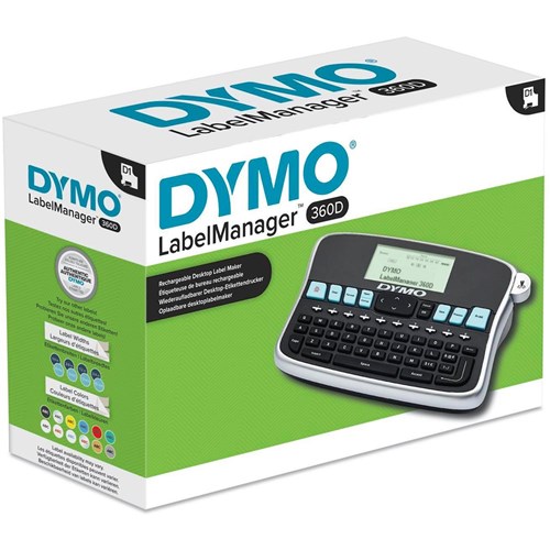 Print on D1 Label Tape & D1 Durable tapes which are available in a variety of colours of sizes 6mm, 9mm, 12mm & 19mm. Lithium-ion battery eliminates the need to buy AA batteries. Label maker lets you quickly type text on the familiar computer-style QWERTY keyboard, edit with one-touch fast-formatting keys. Print up to 10 copies at a time. There are 30+ ways to format text including 3 font styles and 200+ symbols and clip art allowing for customisation. Includes LabelManagerâ„¢ 360D Label Maker, rechargeable Lithium-ion battery, charging adapter, D1 starter label cassette black on white 19mm x 3m. 2 Year Manufacturer's Warranty.