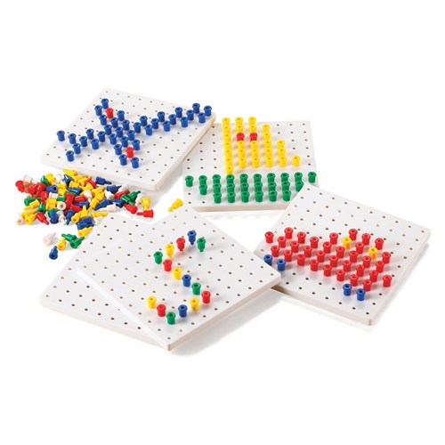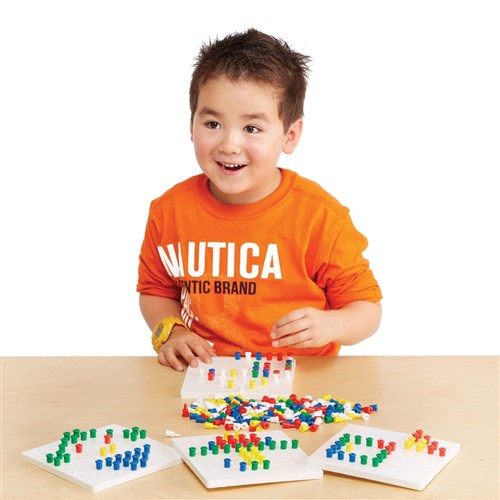 Fine motor skills manipulatives. Set includes 1000 pegs and 5 white peg boards in a set. Each peg board measures 16cm square.