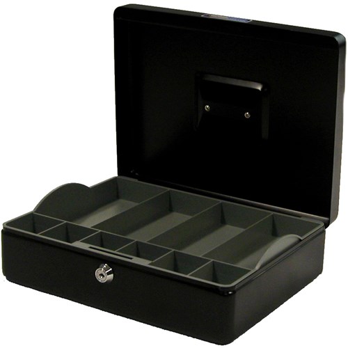 Classic Cash Boxes are fully assembled with a handle that folds neatly into the recess when not in use. Sturdy steel construction with rounded corners allows for greater strength and durability. Supplied with two keys and a partitioned coin tray. Also available in beige.