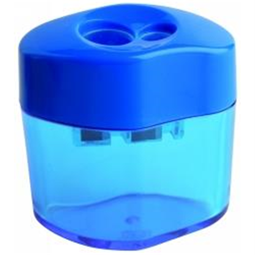 Double hole sharpener that features an ergonomic shape with large container for shavings Hardened steel blade