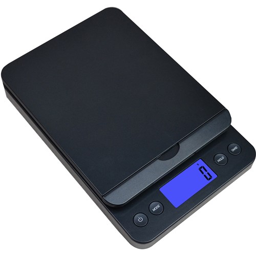 Weighs in grams, ounces, pounds and kilograms Weight Hold and Tare functions Digital display with blue backlit light Measures in 1 gram increments Comes complete with batteries and AC adaptor Rubber foot pads for added stability