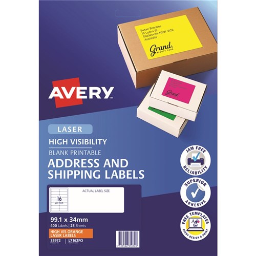 Ideal for labelling products, packaging and marking documents and files for urgent attention. Fluoro coloured labels make your items highly visible and enable instant recognition. Guaranteed Jam Free™ print. Customise your labels with Avery Design and Print, available at averyproducts.com.au/print. TrueBlock® technology, a sliver backing that covers up what's underneath. FSC certified labels made with paper from well-managed forests. Made in Australia. Size: 99.1x34mm 400 labels, 25 sheets. 16 labels per sheet (16UP).