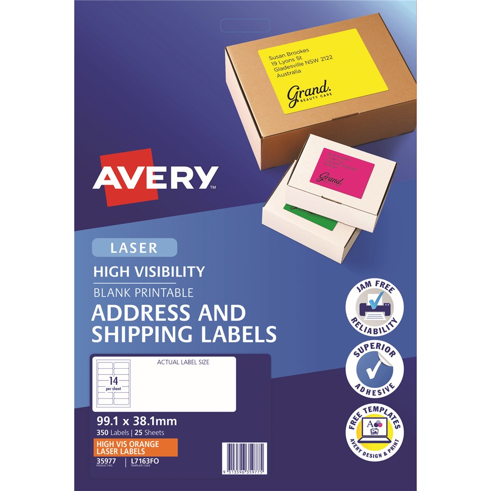 Ideal for labelling products, packaging and marking documents and files for urgent attention. Fluoro coloured labels make your items highly visible and enable instant recognition. Guaranteed Jam Free™ print. Customise your labels with Avery Design and Print, available at averyproducts.com.au/print. TrueBlock® technology, a sliver backing that covers up what's underneath. FSC certified labels made with paper from well-managed forests. Made in Australia. Size: 99.1x38.1mm 350 labels, 25 sheets. 14 labels per sheet (14UP).