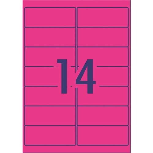 Ideal for labelling products, packaging and marking documents and files for urgent attention. Fluoro coloured labels make your items highly visible and enable instant recognition. Guaranteed Jam Free™ print. Customise your labels with Avery Design and Print, available at averyproducts.com.au/print. TrueBlock® technology, a sliver backing that covers up what's underneath. FSC certified labels made with paper from well-managed forests. Made in Australia. Size: 99.1x38.1mm 350 labels, 25 sheets. 14 labels per sheet (14UP).