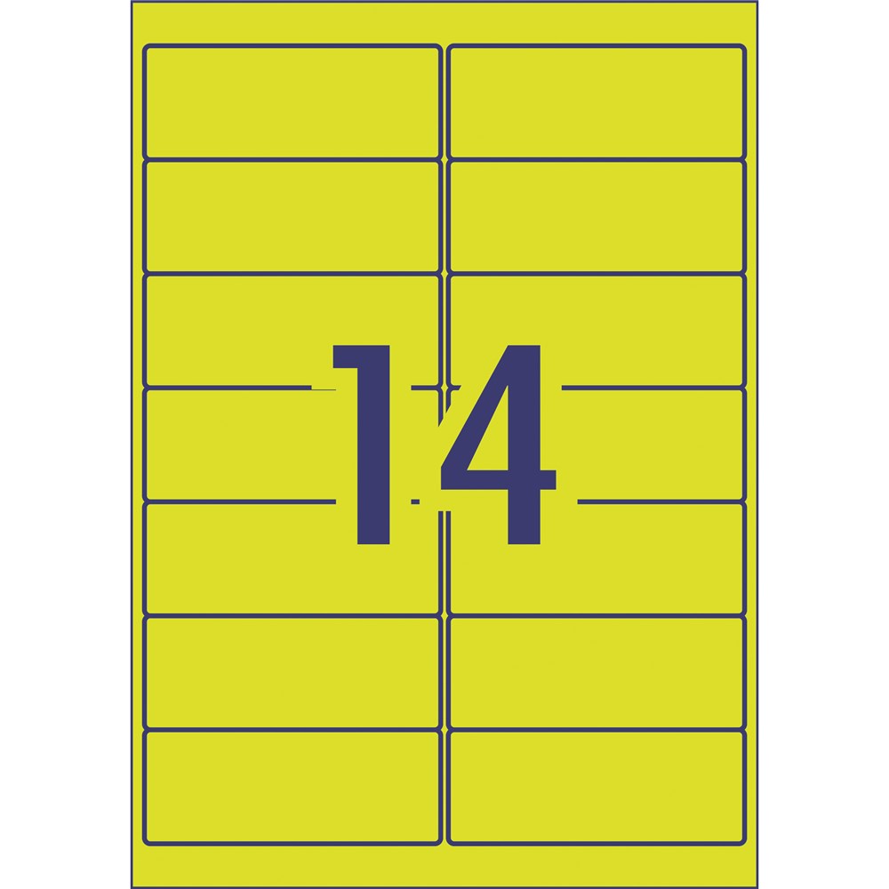 Ideal for labelling products, packaging and marking documents and files for urgent attention. Fluoro coloured labels make your items highly visible and enable instant recognition. Guaranteed Jam Free™ print. Customise your labels with Avery Design and Print, available at averyproducts.com.au/print. TrueBlock® technology, a sliver backing that covers up what's underneath. FSC certified labels made with paper from well-managed forests. Made in Australia. Size: 99.1x38.1mm 350 labels, 25 sheets. 14 labels per sheet (14UP).