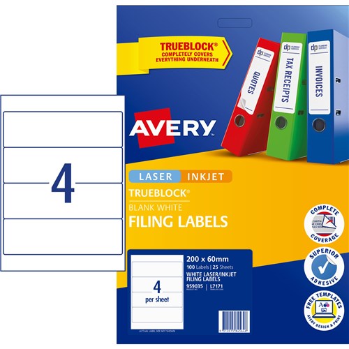 Avery Filing Laser & Inkjet Labels White L7171 200x60mm 4UP 100 Labels 25 Sheets