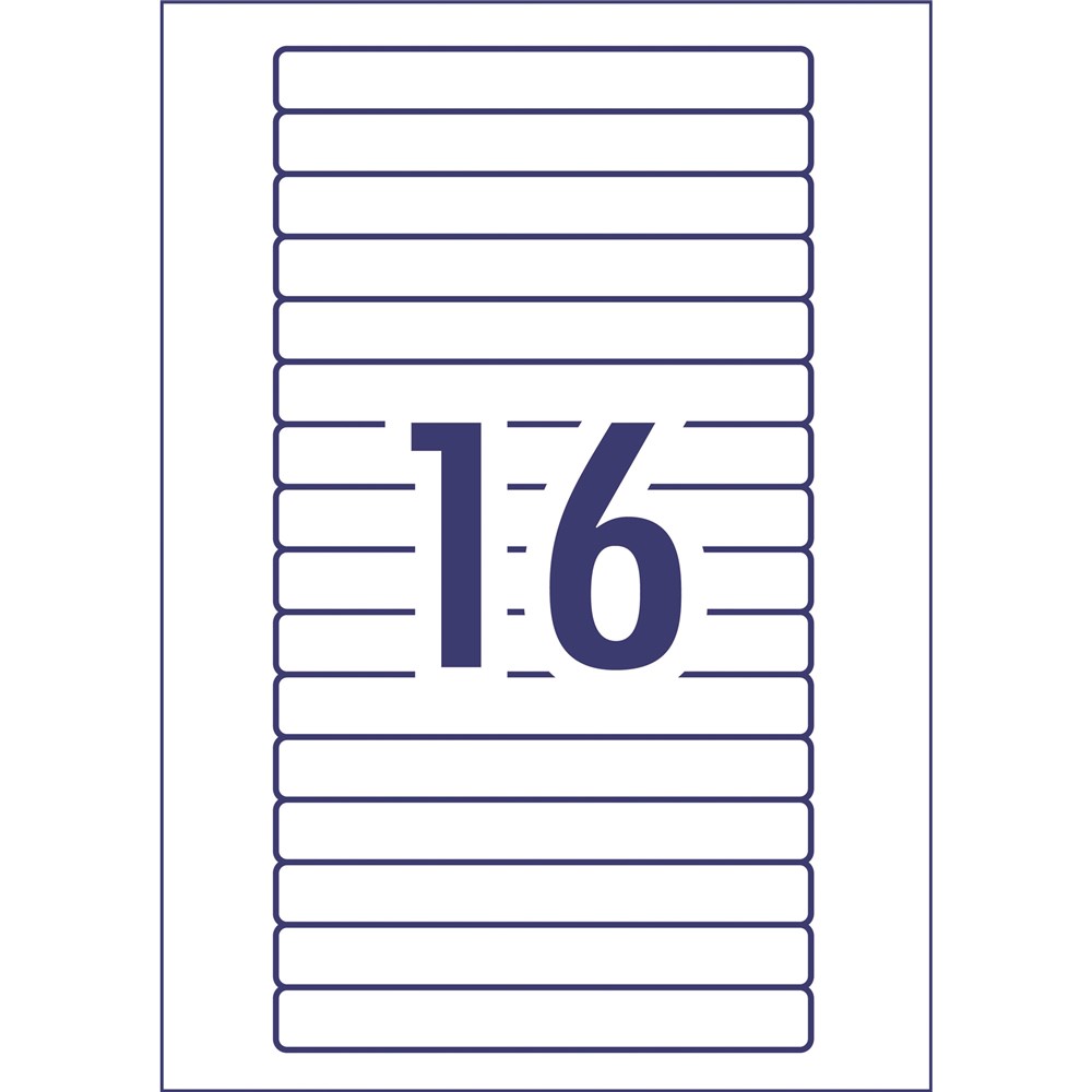 Organise your media for easy retrieval or archiving. Guaranteed jam free printing on laser printers. Compatible with Laser and Inkjet printers. Customise your labels with Avery Design and Print, available at averyproducts.com.au/print. Size: 145x17mm 400 labels, 25 sheets. 16 labels per sheet (16UP).