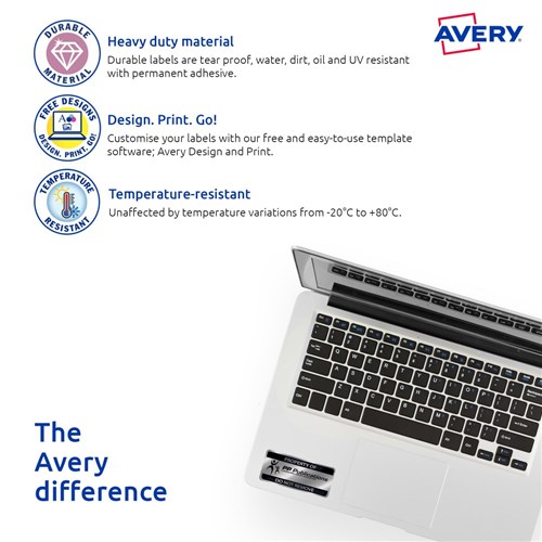 Engineered to take on tough applications where a standard label is not fit for purpose. Durable labels are tear proof, water, dirt, oil and UV resistant with permanent adhesive. Ideal for asset identification on computers, laptops, tablets, tools, labelling medications, samples and containers for use in refrigerators. Unaffected by temperature variations -40°C to +150°C. Customise your labels with Avery Design and Print, available at averyproducts.com.au/print. Size: 25.4mmx10mm 3780 labels, 20 sheets. 189 labels per sheet (189UP).