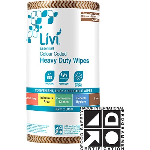 Avoid cross contamination with colour coded wipes which are heavy duty and can be washed and tumble dried up to 5 times. Recommended Use: Brown for use in cafe. HACCP certified, each non woven wipe is 70 grams per square metre making them thick and strong for extra absorbent results. Carton of 4 rolls.