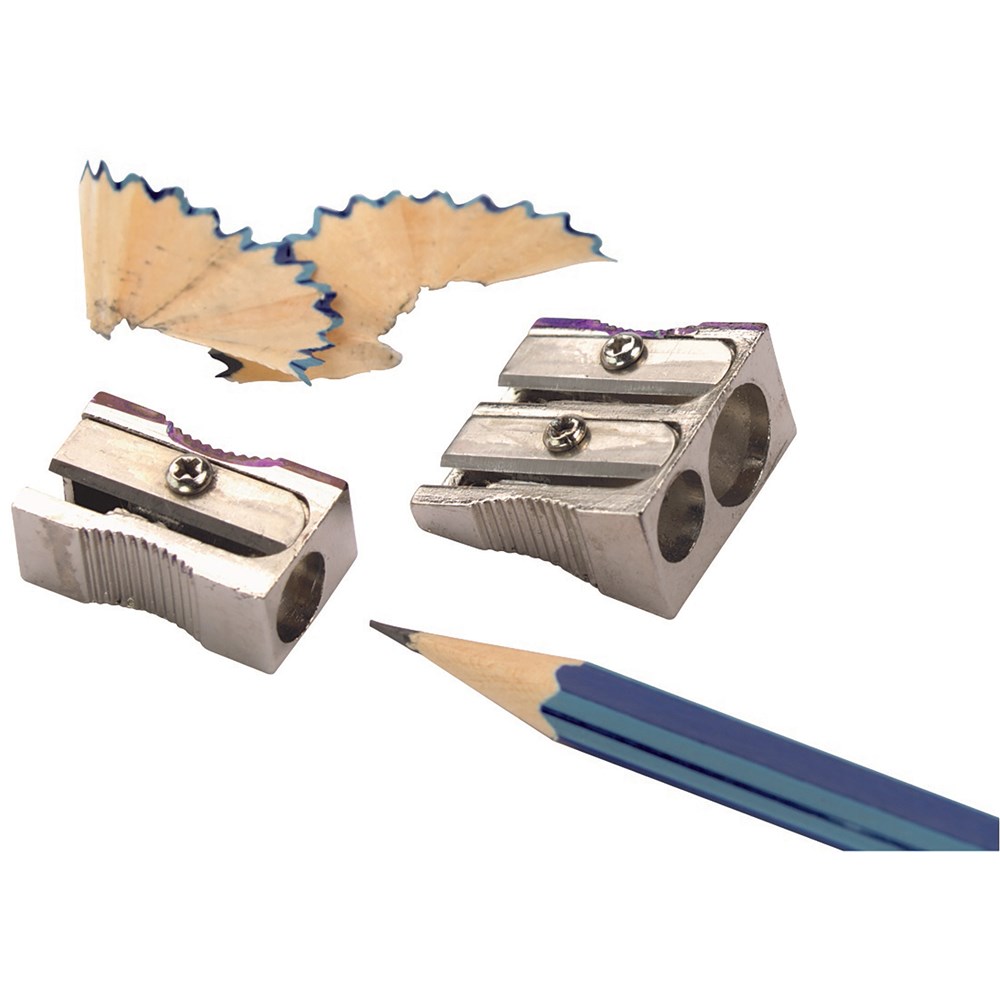 Metal wedge-shape pencil sharpener. Features finger grip for controlled precision sharpening.