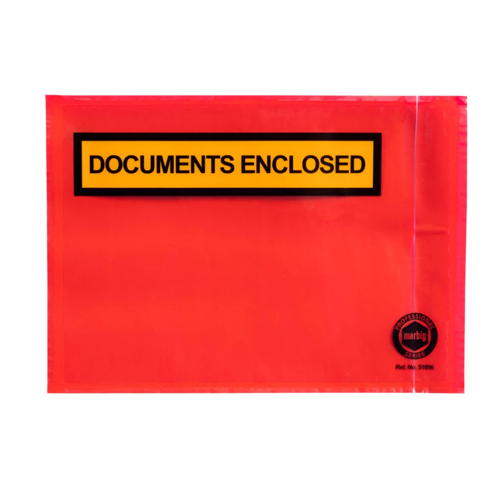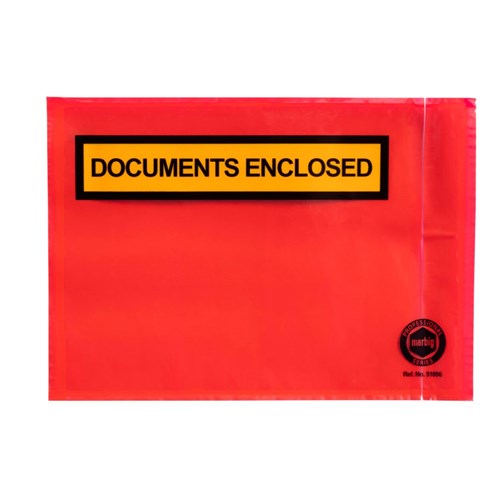 Self Adhesive superior grade adhesive and polyethylene prevent crinkling and sticking to itself. Larger size for multiple documents. Yellow and black print 'documents enclosed'. Red background.