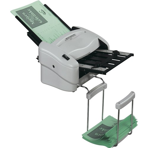 For the office, a small fully functioned A4 folding machine, the 7400 will fold all the common fold types with ease, suitable the small runs of letters invoices etc. Folds up to 4000 folds per hour. Auto stop after last page. Accepts up to 3 stapled sheets. Fold all fold types. Manual fold table settings: Allows all fold types and fine adjustments Feed table capacity: 40 sheets. Unit Dimensions: 340 x 550 x 270mm.