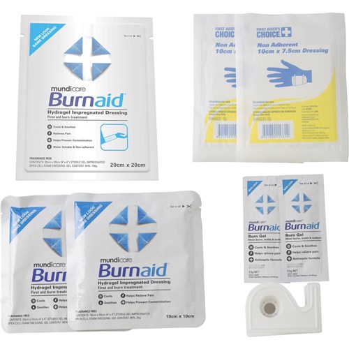 Early intervention to cool and treat burns can help reduce the severity of the injury. Workplace hazards that may result in burn injuries need to have burn management solutions readily available to reduce delays in first aid treatment. Hydrogel can be an effective alternate where no water is available. Packs provide suitable burn treatment products for emergency situations. Health Warning: Always read the label and follow the directions for use. General Information Intended Purpose: A collection of equipment for the initial treatment of minor to moderate injuries.