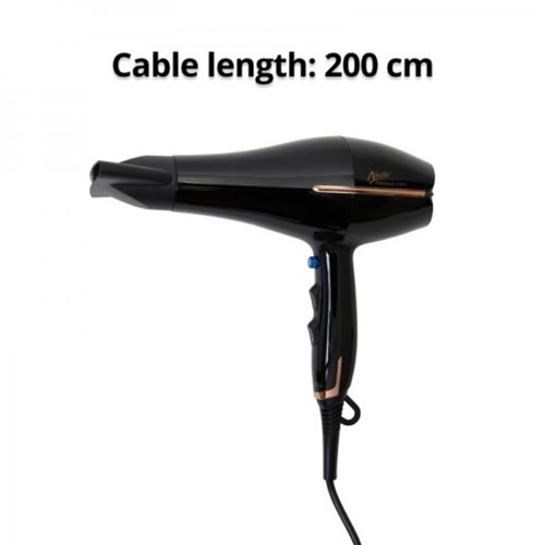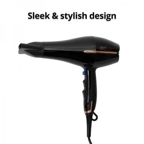 Salon quality with durable and quiet AC motor. 3 heat, 2 speed settings. Sleek and stylish design with included concentrator nozzle. Removable rear cover for easy cleaning. Auto shut off if overheated. Power: 2200 Watt. 200mm cable. Black with copper trim. AUS/NZ Electrical Safety Standards approved. 2 Year Manufacturer's Warranty.