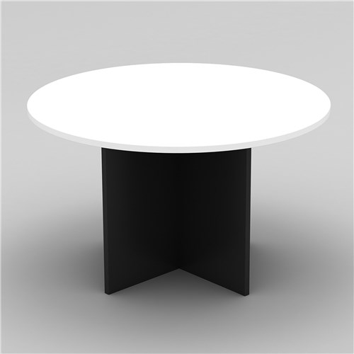 Round meeting table with stable cross base legs. Sturdy 25mm top over 25mm base. Comfortably seats 4 people. E1 grade melamine boards. 3 Year Manufacturer's Warranty. Delivery, installation and assembly charges may apply to furniture. Please enquire to confirm.