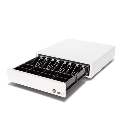 A receipt printer is not required. There are 4 note holders, 8 coin trays for organising currency. It has a durable steel casing. There is a 2-position lock for added security, with 2 keys included. It is colour matched with under counter brackets. The dimensions are 330W x 360D x 90mmH with 80mm cash drawer and 10 mm feet. The cash drawer is a gloss white colour. 1 Year Manufacturer's Warranty.