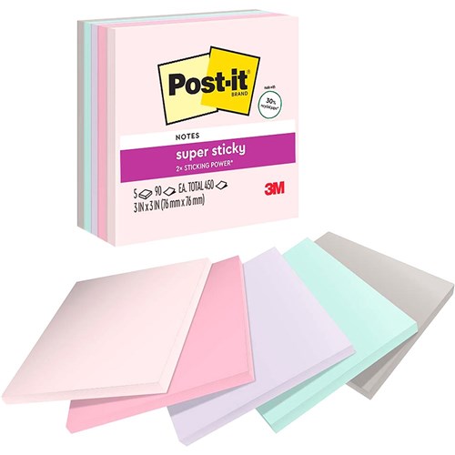 Super Sticky Post-it® adhesive ensures that notes stick practically anywhere such as computer monitors, filing cabinets & furniture, and remain as easily removable as original Post-it® Notes. 90 sheets per pad. Made from 30% post consumer waste.