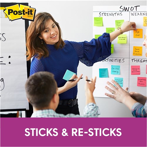 Super Sticky Post-it® Notes now come in great new colour palettes. Super Sticky Post-it® adhesive ensures that notes stick practically anywhere such as computer monitors, filing cabinets & furniture, and remain as easily removable as original Post-it® Notes. Bright colours make your thoughts/highlighted information stand out.