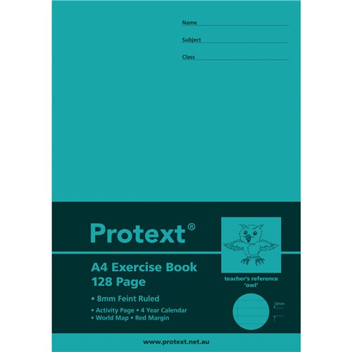 Protext Exercise Book A4 8mm Ruled 70gsm 128 Page Red Margin Owl