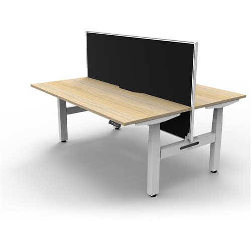 The entire Boost+ range has now been performance tested and is compliant to the AFRDI standards for general safety, strength, durability and stability in all sizes and configurations based on AS/NZS 4442:201. Unit Dimension: 1200mm W x 1500mm D x 1330mm H (Overall). Per User: 1200mm W x 750mm D. Desk Height: 620-1270mm H. Includes pinnable privacy screen in black fabric with matching white powder coated frame. 900mm H x 30mm T. Smooth and quiet adjustment at 38mm per second. Min Digital control panel with 3 pre-set positions, LED display panel, keypad safety lock and reminder alarm setting. Natural Oak coloured worksurface with 750mm depth top. 50mm D scallop cut out to rear. Back to Back Workstation with Screen. Dual motor 3 stage motorised legs. 140kg weight loading capacity. 10 Year Manufacturer's Warranty. Delivery, installation and assembly charges may apply to furniture. Please enquire to confirm.