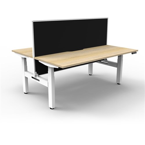 The entire Boost+ range has now been performance tested and is compliant to the AFRDI standards for general safety, strength, durability and stability in all sizes and configurations based on AS/NZS 4442:201. Unit Dimension: 1800mm W x 1500mm D x 1330mm H (Overall). Per User: 1800mm W x 750mm D. Desk Height: 620-1270mm H. Includes pinnable privacy screen in black fabric with matching white powder coated frame. 900mm H x 30mm T. Smooth and quiet adjustment at 38mm per second. Min Digital control panel with 3 pre-set positions, LED display panel, keypad safety lock and reminder alarm setting. Natural Oak coloured worksurface with 750mm depth top. 50mm D scallop cut out to rear. Back to Back Workstation with Screen. Dual motor 3 stage motorised legs. 140kg weight loading capacity. 10 Year Manufacturer's Warranty. Delivery, installation and assembly charges may apply to furniture. Please enquire to confirm.